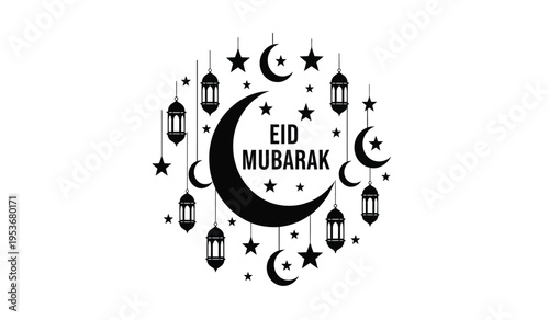 Eid mubarak celebration silhouette with crescent moon lanterns and stars