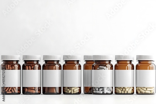 Eight amber pill bottles filled with assorted capsules, each featuring a blank label, stand in a row against a minimalist white background