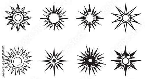 sunburst, sun, icon, icon, black, white, background, symbol, symbol, graphic, design element, design element, illustration, vector, set, collection, starburst, star, sharp, pointed, ray, bright, simple, minimalist, geometric, abstract, logotype, emblem, branding, website, app, interface