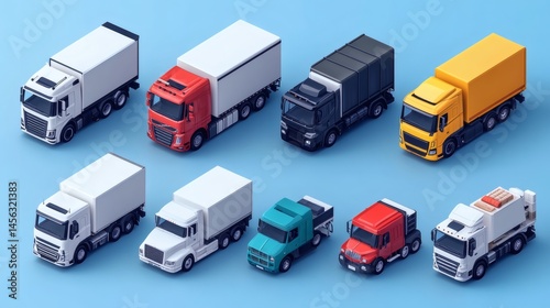 Eight diverse cargo trucks on a blue background, viewed from a high angle.