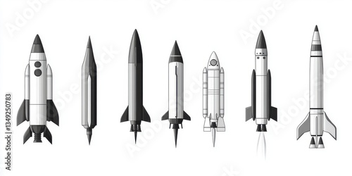 Eight Grayscale Pixel Art Rockets on White Background