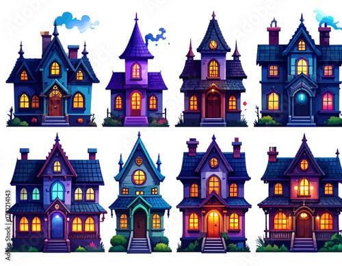 Eight whimsical cartoon haunted houses with glowing windows and pointed roofs in a vibrant color palette.