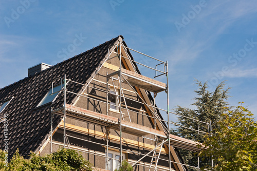 Ein Baugerüst am Giebel eines Hauses mit Spitzdach