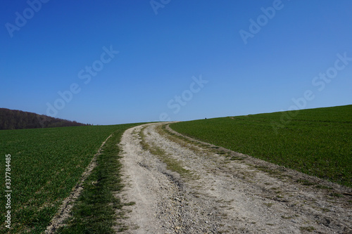 Ein Feldweg, Wanderweg oder Radweg in der Nähe von Delligsen an einem sonnigen Tag im Frühling