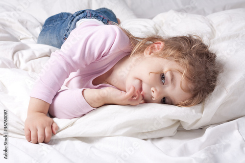 girl, lie, bed, snooze, soft, white, pretty, pretty, happy, fun, finger, mouth, weary, lie, contemplate, thinking