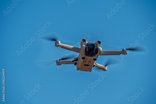 Eine Kameradrohne fliegt vor einem wolkenlosen blauen Himmel