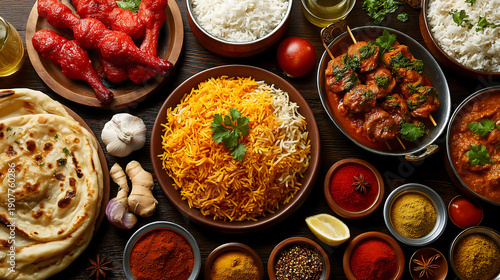 Elaborate Indian Food Spread Overhead with Chicken Tikka Skewers, Curry, Biryani, Naan Bread, Spices and Chutneys on Dark Wooden Table
