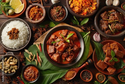 meat, menu, vegetable, tradition, herb, ingredient, hot, coconut, cream, sauce, beef, carrot, elaborate, roasted, health, vegetarian, cooked, kitchen, pastry, eatery, cookery, seafood, pork meat, paste, plate, receipe, pepper, piece, closeup, curry, lifestyle, spicey, savoury, colourful, party, shrimp, banana leaf, celebration, fusion, luxury, food, festive, dinner, main course, meal, lunch, spice, ai
