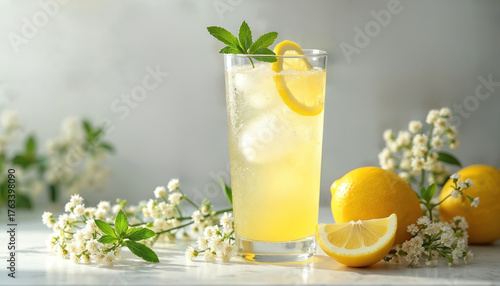Elderflower cordial drink, ice, lemon, mint in tall glass. Sparkling refreshing summer beverage on clean marble counter. Fresh whole lemons, white elderflowers decorate. Natural, healthy, cool liquid