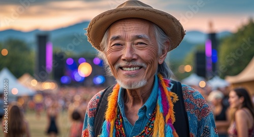 elderly Asian man in music festival boho style portrait smiling happy landscape background ad concept with copy space