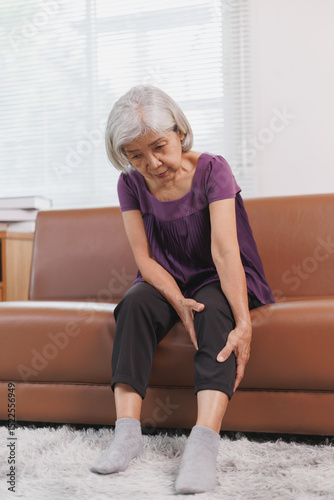 senior, woman, knee, pain, joint, leg, arthritis, osteoarthritis, injury, muscle, health, problem, health care, medicals, ageing, elderly, asian, people, female, sitting, sofa, living, room, home, indoor, relief, massage, physical, therapy, retirement, wellness, lifestyle, comfort, relaxation, support, care, assistance, geriatric, age, adult, old, domestic, life, house, apartment
