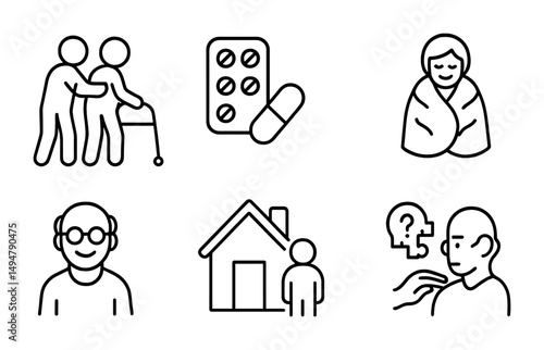 elderly, care, outline, icon, set, wellness, geriatric, symbol, flat, vector, medicals, design, nurse, ageing, assistance, retirement, nursing, home, support, medicine, treatment
