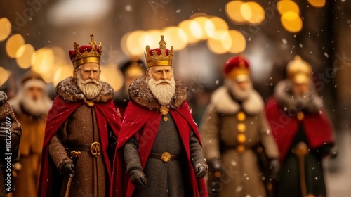 elderly, caucasian, king, regal, parade, snow, winter, crown, royalty, fur, beard, festive, celebration, tradition, historical, mediaeval, group, man, costume, elder, procession, majestic, aristocracy, nobility, christmas, light, holiday, december, snowfall, street, event, cultural, gathering, heritage, nostalgia, timeless, elegance, grandeur, seasonal, ambience