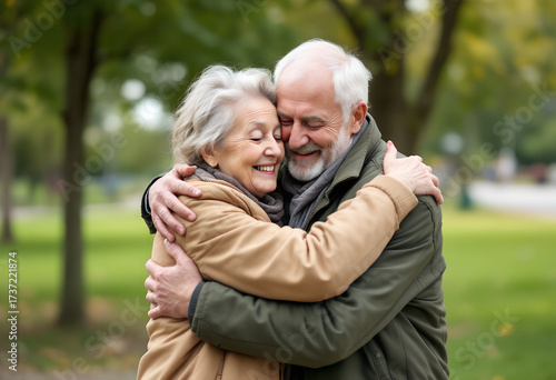 Elderly couple hugging in park autumn day
