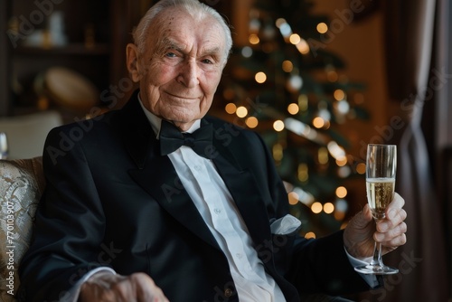 Elderly gentleman in a tuxedo with a champagne flute smiles in front of a festive Christmas background