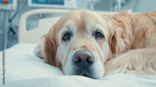 dog, gold, retriever, sick, ill, hospital, veterinary, animal, pet, sad, elderly, old, disease, care, medicals, treatment, health, recovery, patient, vet, canino, mammal, domestic, companion, senior, welfare, pet, bed, worried, concern, affection, comfort, hope, healing, support, faith, trust, love, compassion