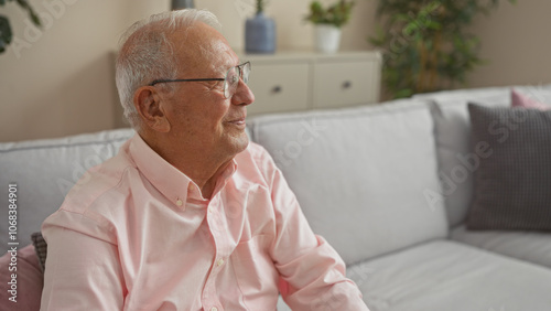 elderly, grey-haired, caucasian, man, home, living, room, goggles, pink, shirt, senior, indoor, interior, apartment, mature, sitting, relaxed, content, comfortable, sofa, casual attire, friendly, smiling, happy, peaceful, quiet, aged, residence, cosy, portrait, domestic, pensive, thoughtful, expression, decor, background, modern, style, plant, homelike, relaxation, daytime, grey, hair, closet, cupboard