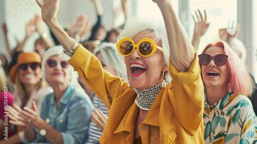 elderly, group, friends, cheering, front, row, fashion, show, fashion show, enthusiastic, style, excitement, audience, event, stylish, fashion industry, crowd, celebrate, joyous, camaraderie, spectator