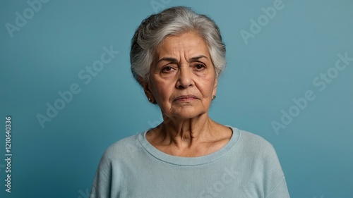 elderly hispanic female in casual wear on pastel color background model portrait looking serious for ad concept space for text