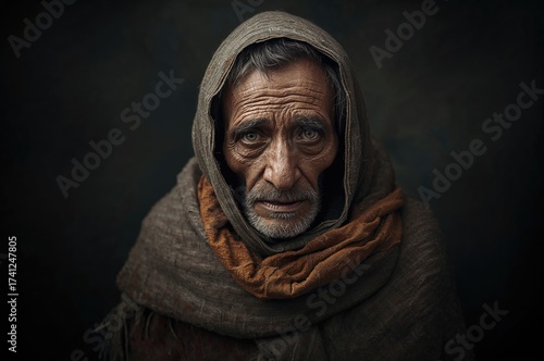 Elderly homeless man with deep-set eyes wearing a worn shawl reflecting hardship and suffering, captured in a poignant close-up portrait.