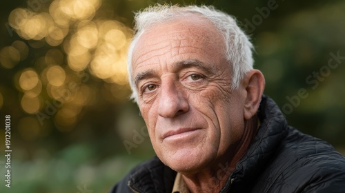 Elderly man in a plain jacket looks at the camera in a park during golden hour with green bokeh in the background