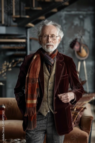 Elderly man in a tailored velvet suit, paired with a designer silk scarf, in a luxe studio setting