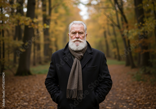 man, elderly, beard, autumn, forest, standing, outdoors, nature, tree, leaf, calm, serious, coat, foulard, brown, yellow, foliage, path, quiet, mature, sunlight, male, portrait, expression, seasonal, closeup, lifestyle, peace, warmth, traditional, comfortable, countryside, rural, natural, tranquil, clothing, detail, relaxation, solitude, age, character, landscape, environment, season, leisure, serenity, gentleman, senior