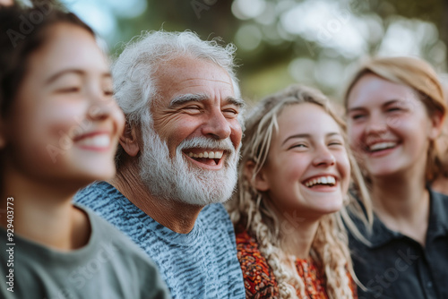 man, woman, elderly, young, smiling, happy, outdoors, group, joyful, beard, white, hair, generation, laughing, together, family, friendship, tree, nature, sunlight, casual attire, summer, closeup, face, diverse