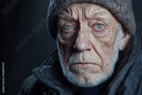 elderly, man, blue, eye, warm, hat, deep, wrinkle, face, expression, age, wisdom, portrait, dark, background, emotion, character, weathered, serious, life, life events, detail, feature, grey, hair, sombre, thoughtful, introspective, ageing, tiredness, humanity, personality, solitude, realism, story, depth, texture, winter, clothing, older, gaze, mood, facial, heritage, authenticity, line, inner, strength, vulnerability