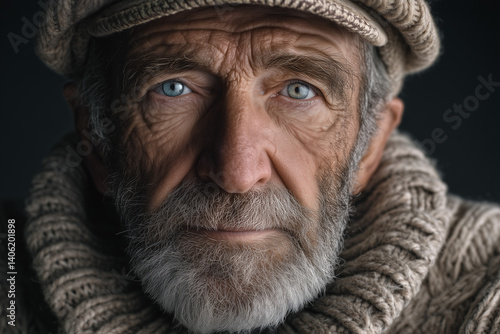 elderly, man, blue eye, sweater, wrinkle, face, character, expression, gaze, age, texture, depth, wisdom, life, detail, portrait, clothing, warmth, cosy, natural light, closeup, emotion, personality, hair, facial hair, traditional, old man, style, background, sharpened, serenity, charme, aged, contemplation, authenticity, insight, storytelling, culture, masculinity, attire, life events, feature, fashion, rugged