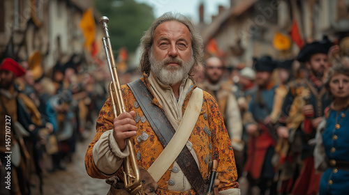 musician, elder, trumpet, vintage, festival, costume, tradition, celebration, historic, parade, event, france, mediaeval, performer, instrument, culture, attire, craft, street, noble, heritage, historical, fair, outfit, character, vibrant, portrait, classic, style, artisan, bequest, village, march, ceremony, festivity, pride, ancestry, performance, ambience, sound, emotion, folklore
