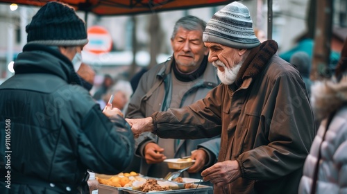 elderly, charity, help, cold weather, hat, jacket, winter clothes, street, food, nourishment, society, homeless, community, kindness, volunteer, old, senior, outdoors, jacket, casual attire, photogenic, looking, man, beard