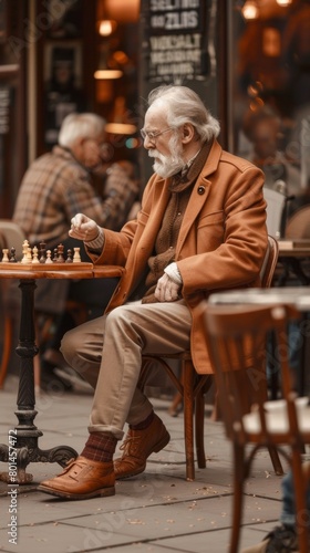 Elderly Stylish Man Playing Chess in City Cafe: Intergenerational Street Style