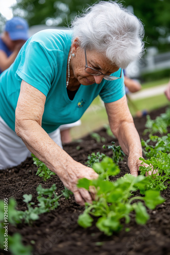 elderly woman gardening, nurturing plants, community gardening, green thumb