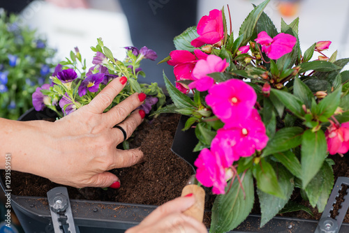 elderly, woman, gardening, hand, flower, gerbera, daisy, impatiens, planting, garden, vibrant, pink, purple, red, green, foliage, bloom, horticulture, nature, care, dirtied, beauty, life, senior, manicure, nurture, plant, blossom, colourful, loving, landscape, mature, flora, cultivation, home, pot, trowel, delicate, nurturing, hobby, crop, anonymous, unrecognizable, from above