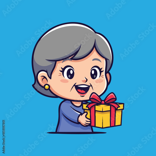 woman, elderly, senior, gift, present, box, ribbon, bow, grey hair, happy, smile, cheerful, giving, offering, blue, yellow, red, background, cartoon, character, people, female, gesture, celebration, holiday, party, happiness, joy, hand, holding, cute, friendly, isolated, bright, colourful, vector, illustration