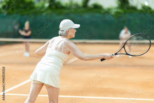 Elderly woman playing doubles tennis against opponent team on tennis court