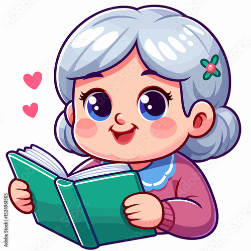 elderly, woman, reading, book, smile, cartoon, illustration, learning, cognition, education, indoor, casual attire, lifestyle, literature, home, happy, positive, senior, storytelling, imagination, study, wisdom, library, relaxation, peaceful, hobby, passion, concentration, enjoyment, smiling face, read