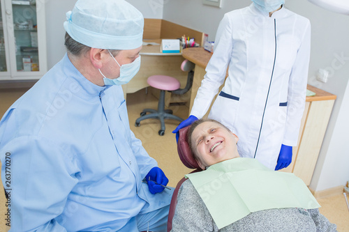 Elderly woman sits in a dental chair as a patient. People health care, dentistry, medicine concept. Doctor and patient. Teeth dentist with patient in hospital Description