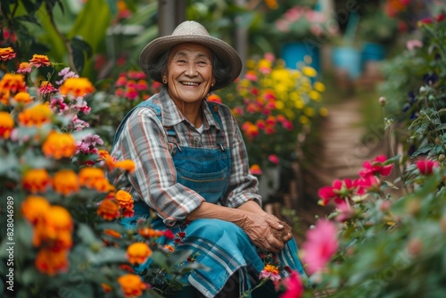 elderly, woman, smiling, vibrant, flower, garden, surrounded, colourful, bloom, greenery, joy, contentment, gardening, sunny, setting, nature, beauty, growth, nurture, horticulture, earth, texture, detail, environment, spring, blossom, bright, field, organic, flora, day, fresh, activity, tender, effort, floral, scene, work, landscape, botany, natural, cheerful, planting