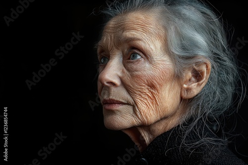 woman, elderly, old, aged, face, wrinkle, skin, grey, hair, eye, blue, gaze, pensive, thoughtful, expression, portrait, closeup, detail, texture, line, time, ageing, senior, mature, beauty, wisdom, life, life events, contemplation, introspection, emotion, feeling, black, background, elegant, graceful, delicate, fragile, human, person, photograph