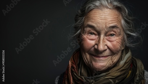 Elderly woman with gray hair, smiling warmly Grace radiant senior woman, her eyes reflecting wisdom and a lifetime of experiences, exuding quiet confidence and elegance.
