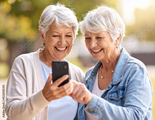 Elderly Women Exploring Technology. Laughing and looking at mobile phone together