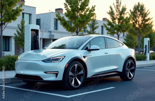 Electric car at modern charging station and charge the battery Future innovative EV charging station