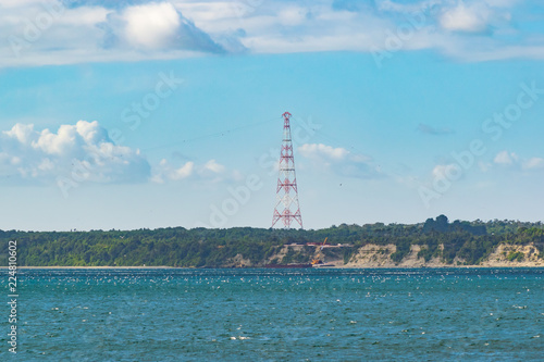 Electric high tension tower by the sea