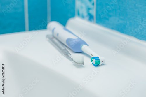 Electric toothbrush versus manual toothbrush in bathroom. Oral care and prevention concept.