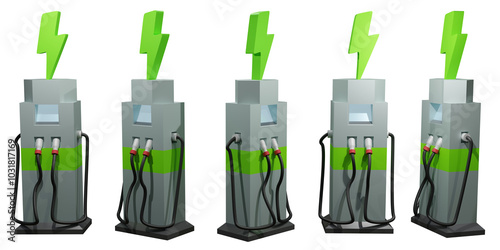 Electric vehicle charging station from different angles. 3D render without background in high resolution.