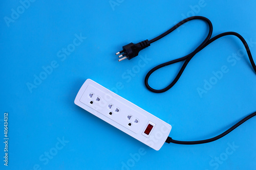 Electrical power strip and plug on blue background. Top view