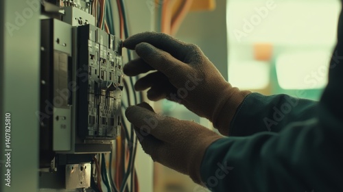 electrician, installing, circuit, breaker, commercial, building, precision, electrical, expertise, work, optical, men at work, glove