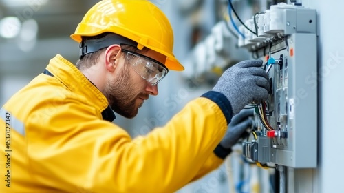 electrician, maintenance, indoor, facility, performing, safety, repair, equipment, wiring, inspection, control, technician, infrastructure, voltage, labor, skill, efficiency, system, operation, design, environment, risk, training, innovation, dependability, automation, process, project, quality, management, compliance, teamwork, overview, closeup, hard hat